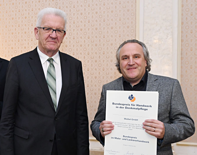 Wir haben den Bundespreis für Handwerk 2019 in der Denkmalpflege erhalten. Das war eine große Freude, den 1. Preis, Bundespreis für Handwerk in der Denkmalpflege 2019 in BW direkt aus den Händen von Ministerpräsident Winfried Kretschmann zu bekommen.
